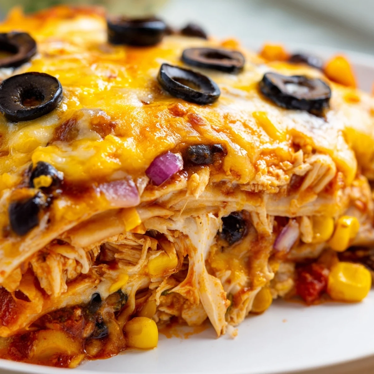 This Tex-Mex inspired casserole brings together layers of tender shredded chicken, savory red enchilada sauce, black beans, sweet corn, and gooey melted cheese. The dish bakes up bubbly and golden, creating a comforting meal that's perfect for feeding a family or gathering.