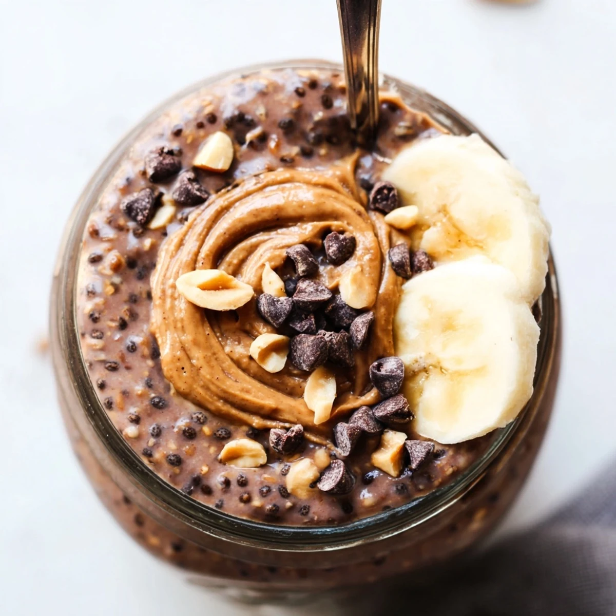 The base features old-fashioned rolled oats soaked in milk and Greek yogurt, creating a creamy texture. Unsweetened cocoa powder provides deep chocolate flavor, while generous amounts of creamy peanut butter add richness and protein. Chia seeds offer extra thickness and nutritional benefits.