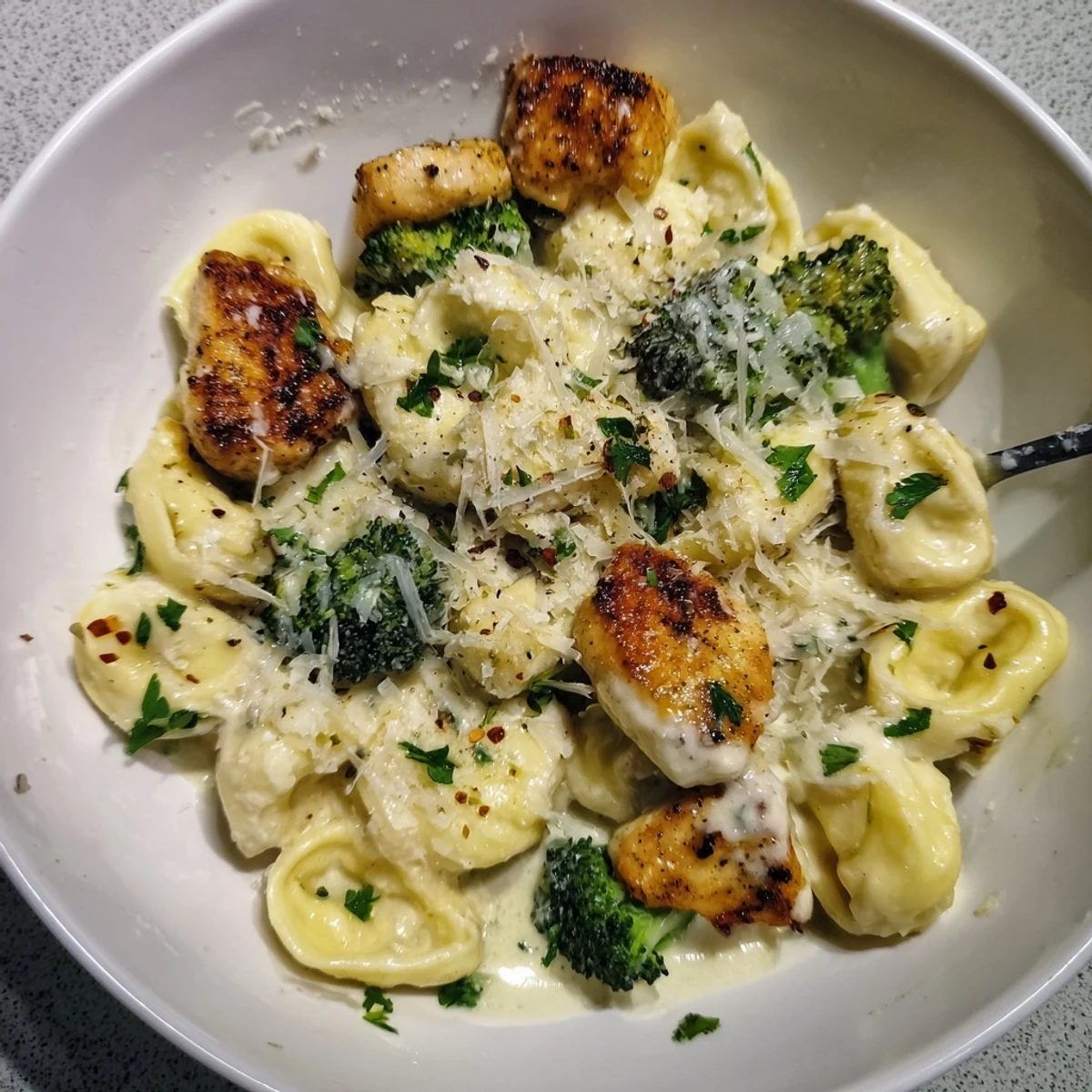 Sear bite-sized chicken until golden, then remove and sauté garlic in butter. Lower heat, add heavy cream and grated Parmesan, stirring until the sauce thickens. Boil cheese tortellini and add broccoli for the last two minutes; drain and fold into the skillet with the chicken. Toss to coat, season, and finish with extra Parmesan and parsley. Serves four, with simple swaps for lighter or juicier results.