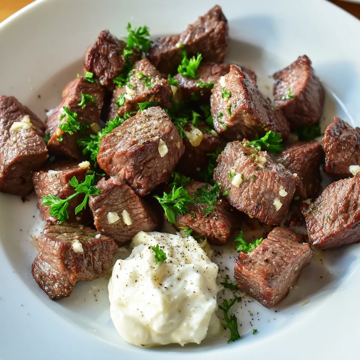 Adding garlic butter after searing coats the steak bites in rich, aromatic flavor and keeps them moist.