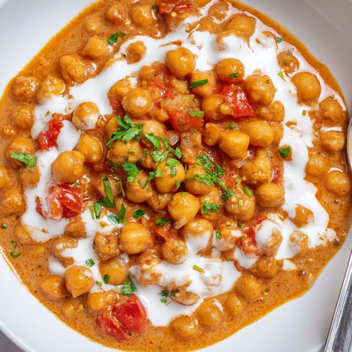 This creamy chickpea curry combines tender chickpeas simmered in a spiced tomato-onion base, then gently folded with tangy Greek yogurt for richness. Toasting cumin and blooming ground spices builds depth; simmer until the sauce reduces, then remove from heat before adding yogurt to prevent curdling. Serve with basmati rice or naan and garnish with cilantro for brightness.