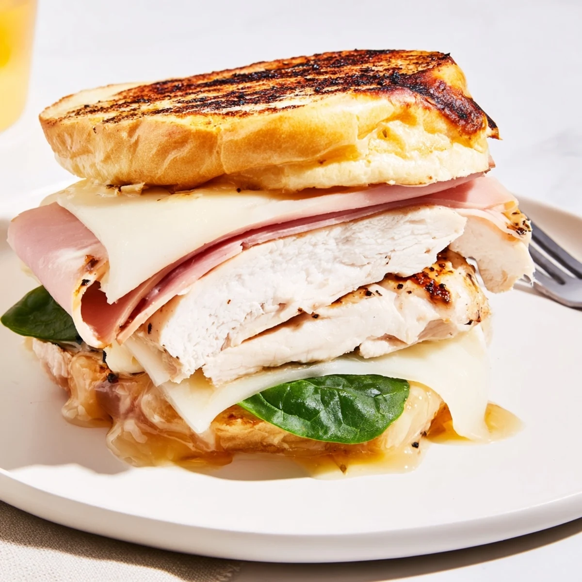 This grilled Cordon Bleu sandwich layers pounded chicken breasts seasoned with garlic, onion and thyme, topped with smoked ham and melting Swiss. Grill chicken 5–7 minutes per side, add ham and cheese near the end to melt, and toast buttered buns. Whisk mayonnaise, Dijon, honey and lemon for a bright sauce, pile on baby spinach, assemble and serve hot for 4 generous sandwiches.