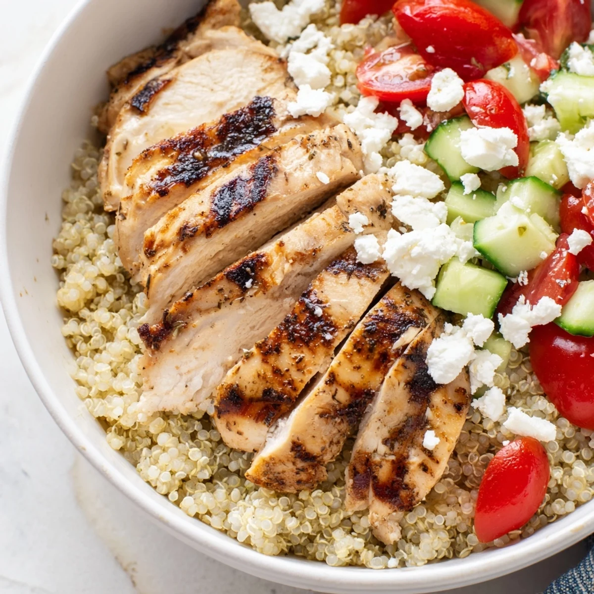 This wholesome Mediterranean bowl brings together tender marinated grilled chicken, fluffy quinoa, and crisp vegetables for a satisfying meal. The zesty lemon-herb dressing ties everything together, while feta and Kalamata olives add authentic Mediterranean flair. Perfect for meal prep or a nutritious weeknight dinner.